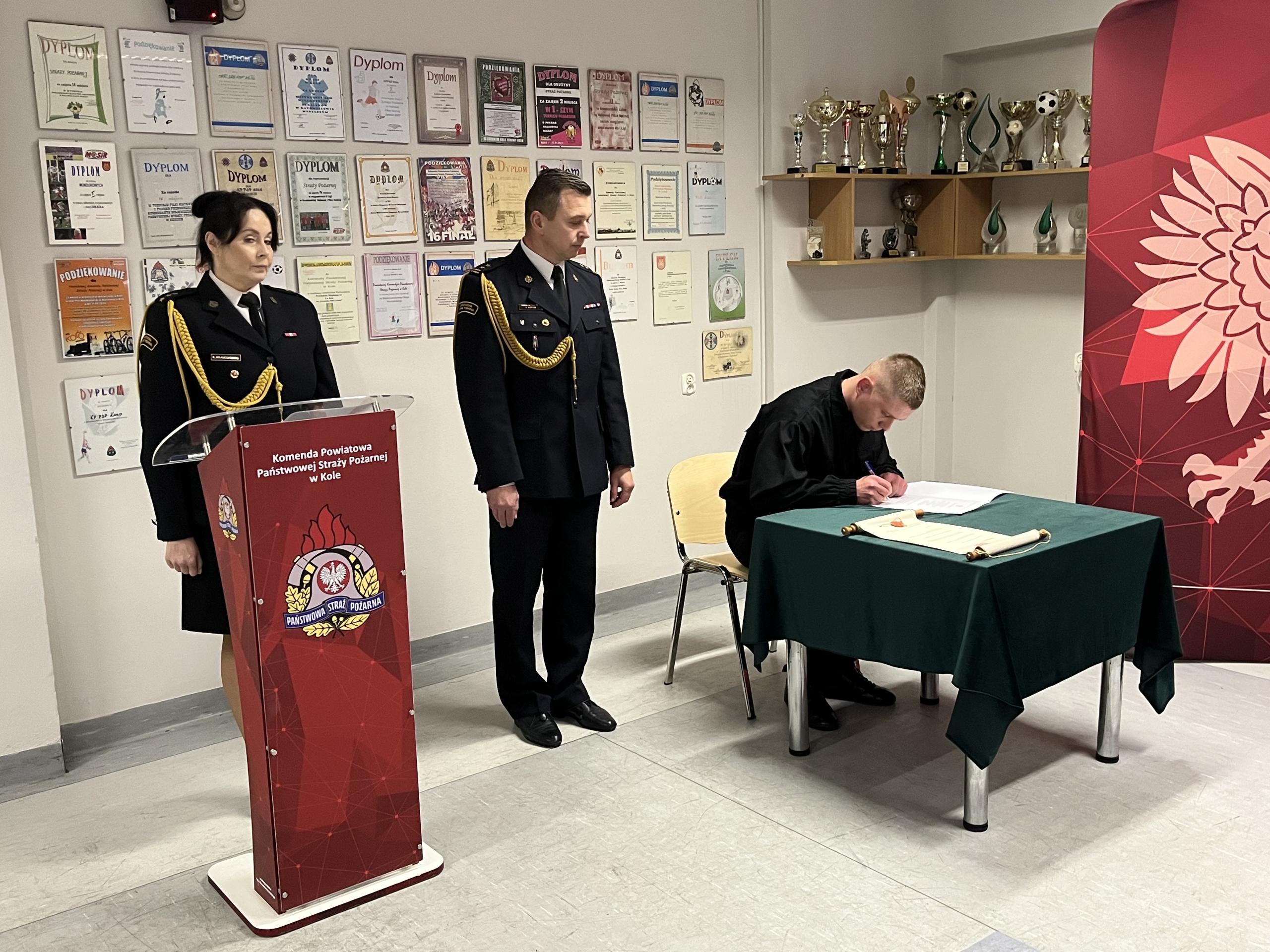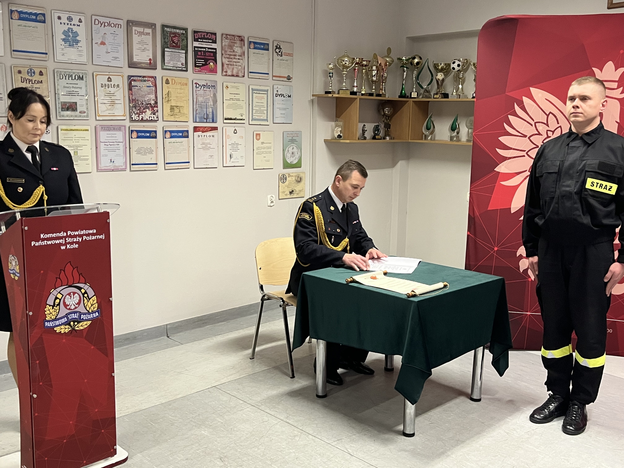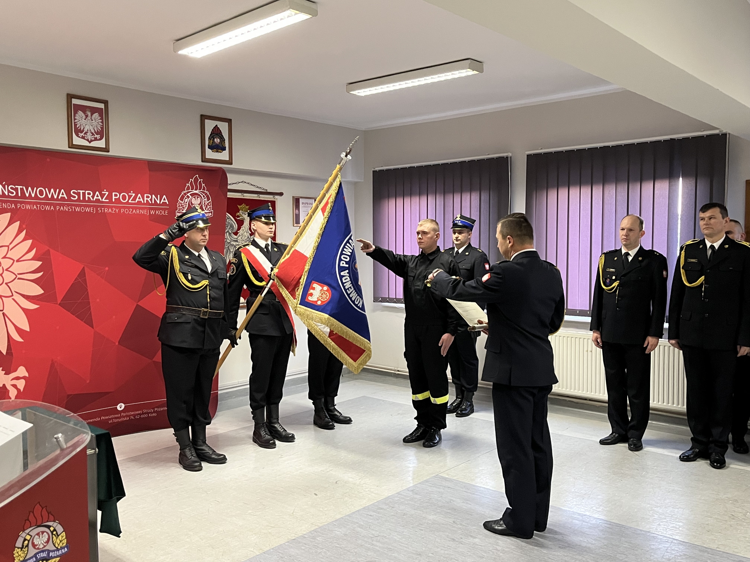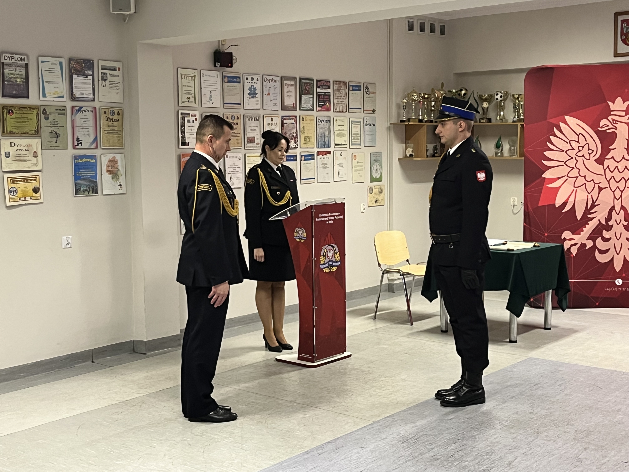 Dnia 19.12.2025 r. w świetlicy Komendy Powiatowej Państwowej Straży Pożarnej w Kole odbyła się uroczysta zbiórka z okazji ślubowania nowoprzyjętego funkcjonariusza oraz wręczenia odznaczenia i nadania wyższych stopni służbowych z okazji Święta Niepodległości. Ślubowanie przyjął Zastępca Komendanta Powiatowego Państwowej Straży Pożarnej w Kole bryg. Arkadiusz Wypiór, który powitał w szeregach Państwowej Straży Pożarnej funkcjonariusza str. Patryka Grochocińskiego. W/w funkcjonariusz wypowiedział słowa roty ślubowania i podpisał akt ślubowania. W swoim wystąpieniu Zastępca Komendanta Powiatowego PSP w Kole bryg. Arkadiusz Wypiór zaznaczył, iż jest to bardzo uroczysty moment w życiu zawodowym, postrzegany jako coś podniosłego oraz stanowi symbol pełnego włączenia do cieszącej się społecznym uznaniem służby i wzmacnia świadomość własnej tożsamości zawodowej. W drugiej części uroczystej zbiórki wręczono odznaczenie i akty nadania wyższych stopni służbowych z okazji Święta Niepodległości: