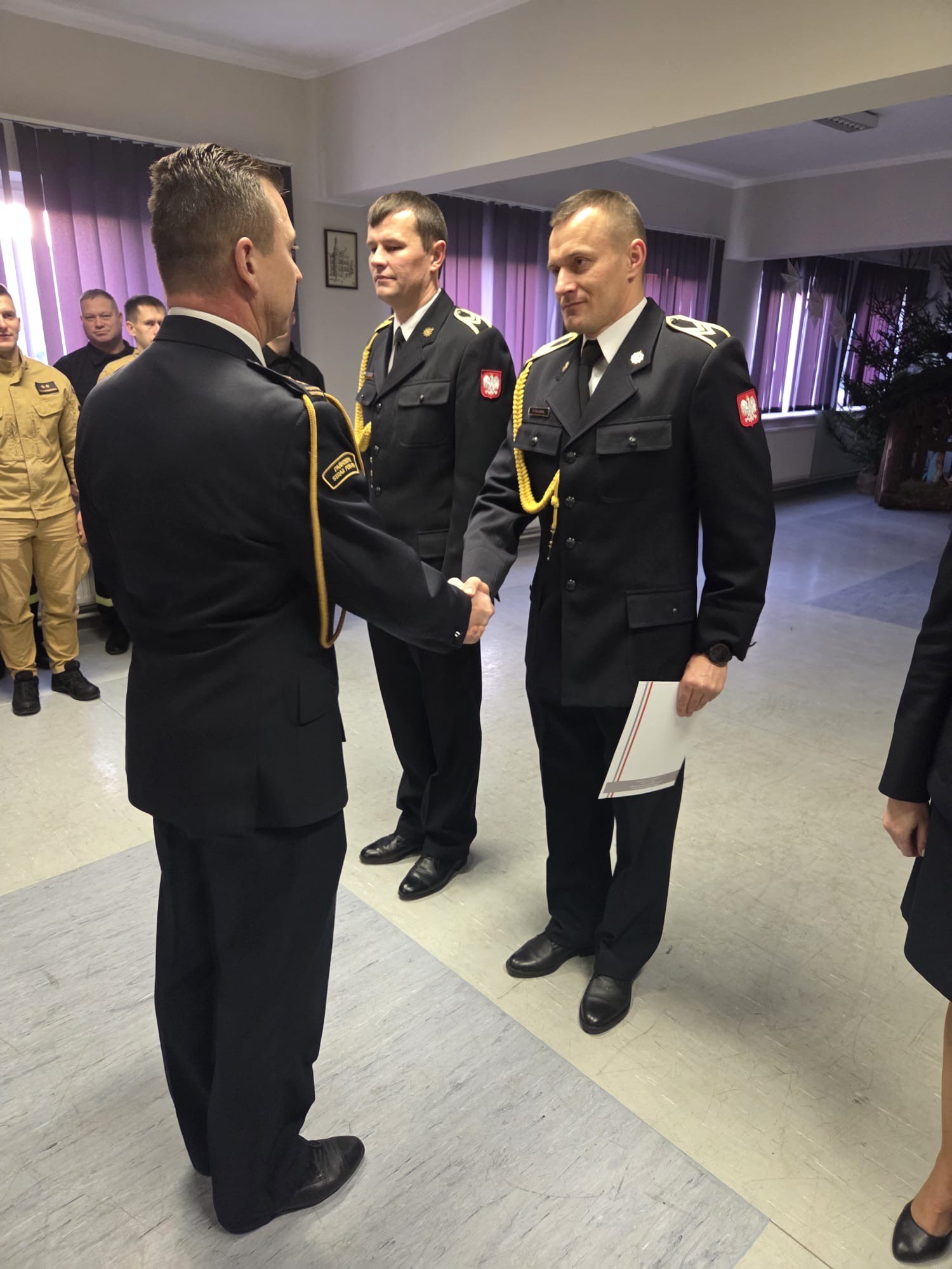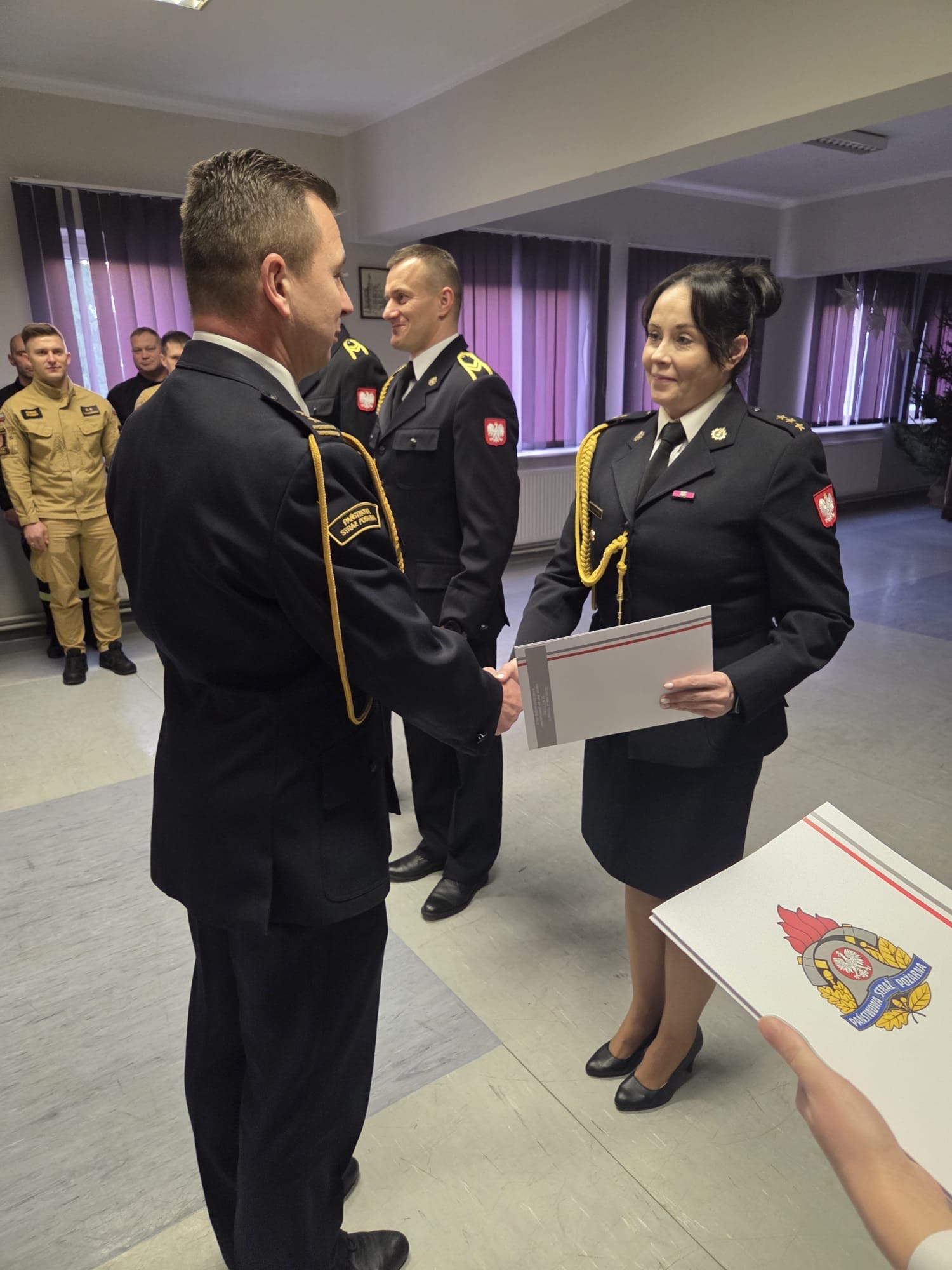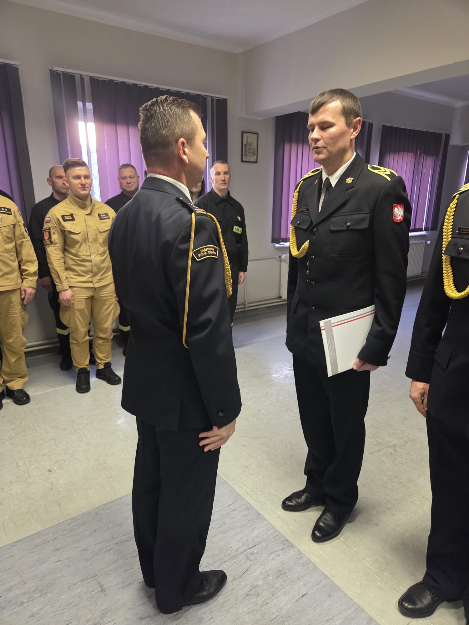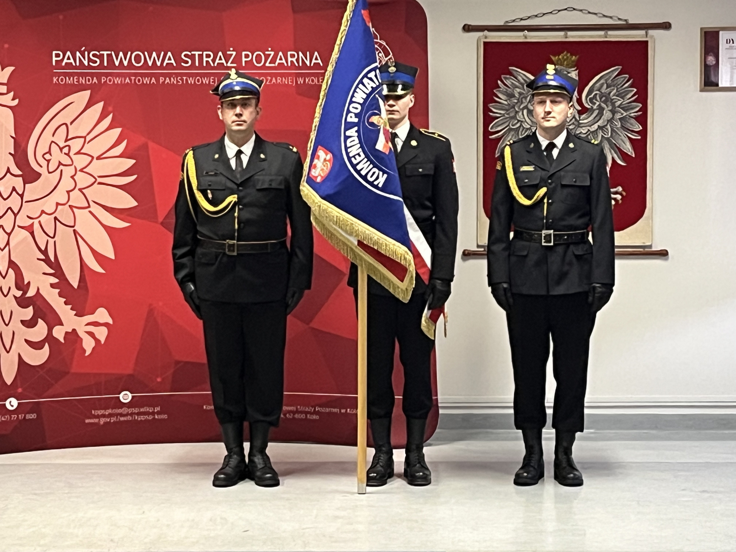 Dnia 19.12.2025 r. w świetlicy Komendy Powiatowej Państwowej Straży Pożarnej w Kole odbyła się uroczysta zbiórka z okazji ślubowania nowoprzyjętego funkcjonariusza oraz wręczenia odznaczenia i nadania wyższych stopni służbowych z okazji Święta Niepodległości. Ślubowanie przyjął Zastępca Komendanta Powiatowego Państwowej Straży Pożarnej w Kole bryg. Arkadiusz Wypiór, który powitał w szeregach Państwowej Straży Pożarnej funkcjonariusza str. Patryka Grochocińskiego. W/w funkcjonariusz wypowiedział słowa roty ślubowania i podpisał akt ślubowania. W swoim wystąpieniu Zastępca Komendanta Powiatowego PSP w Kole bryg. Arkadiusz Wypiór zaznaczył, iż jest to bardzo uroczysty moment w życiu zawodowym, postrzegany jako coś podniosłego oraz stanowi symbol pełnego włączenia do cieszącej się społecznym uznaniem służby i wzmacnia świadomość własnej tożsamości zawodowej. W drugiej części uroczystej zbiórki wręczono odznaczenie i akty nadania wyższych stopni służbowych z okazji Święta Niepodległości: