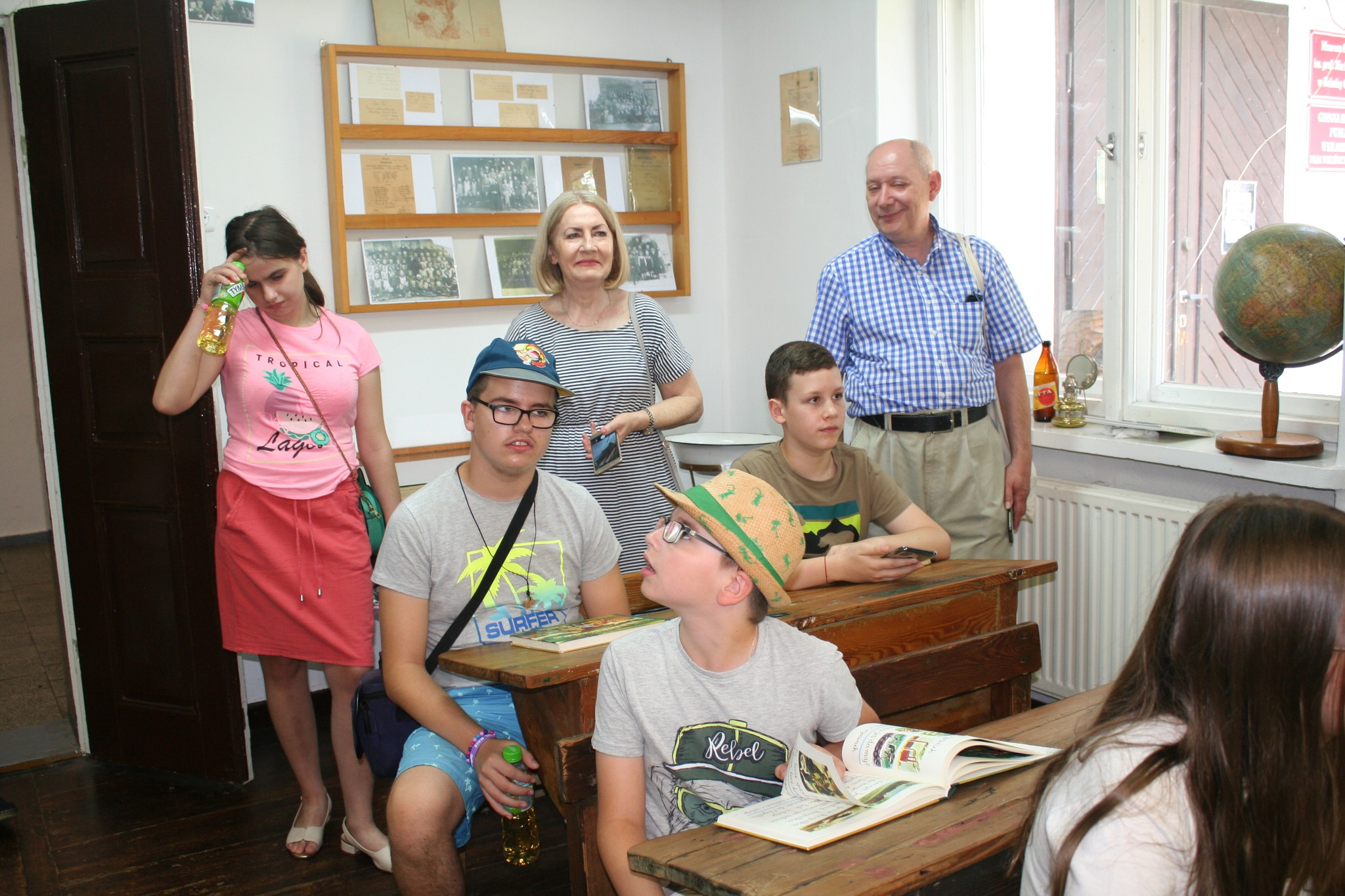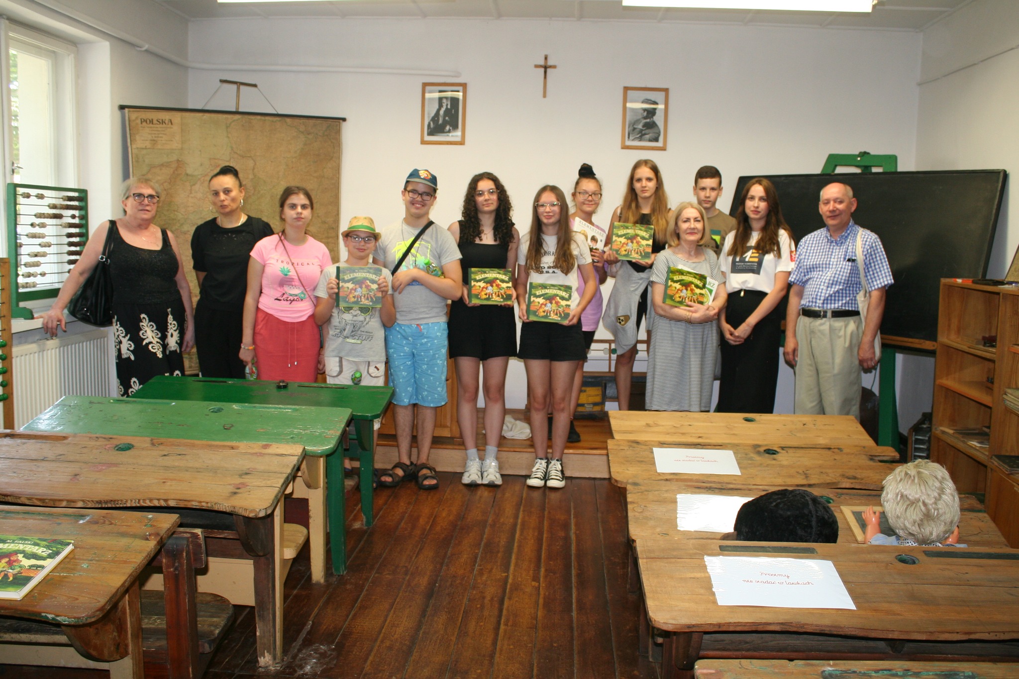 Do lat swojego szkolnego dzieciństwa powrócili na chwilę wspólnie z dziećmi starsi uczestnicy wakacyjnej wyprawy do Muzeum ELEMENTARZA prof. Mariana Falskiego w Kuźnicy Grabowskiej w pow. Ostrzeszowskim w gminie Kraszewice. W dawnym dworku rodziny Oxnerów, z których córką Reginą Oxner prof. Marian Falski zawarł związek małżeński, na przełomie lat 2004/2005 założono Muzeum ELEMENTARZA szkolnego napisanego 70 lat temu przez profesora. I przez te lata, do polowy niemal lat 70 tych XX wieku, był on podstawowym podręcznikiem, najdłużej na świecie, nauki czytania w szkołach podstawowych. Historia ELEMENTARZA jest bardzo bogata, podobnie jak i sam życiorys profesora, my natomiast zainteresowaliśmy się obiektem muzealnym. Wspominałem nie tak dawno o Elementarzu Falskiego w swoich felietonach …spacerkiem po dawnym Kole…. Nas tym razem zainteresowała rekonstrukcja dawnej klasy szkolnej z lat 50-tych XX wieku z drewnianymi ławkami i z otworami na kałamarze, dawne obowiązkowe fartuszki ze szkolnymi tarczami i całe oryginalne, z tamtych lat, urządzenie klasy. Był nawet dzwonek szkolny, którym ponad 70 lat temu woźny szkolny regulował czas trwania zajęć lekcyjnych. Poduszki do klęczenia w kącie klasy za karę dla niesfornych uczniów, czy drewniane piórniki, którymi nauczyciel wymierzał na dłoniach uczniów jego przewinienia. W muzealnych zbiorach eksponowane są i elementarze niemal z całego świata wzorowane jak wspomniała nam sama pani dyrektor muzeum Ewa Maląg, na elementarzu prof. Mariana Falskiego. Warto z młodzieżą szkolną wybrać się na tę niezwykłą lekcję historii a i starszym na pewno do gustu przypadnie ta wspaniała sentymentalna podróż w czasie. Kierownikiem wyprawy był Tomasz Nuszkiewicz – dyrektor Kolskiego Muzeum.