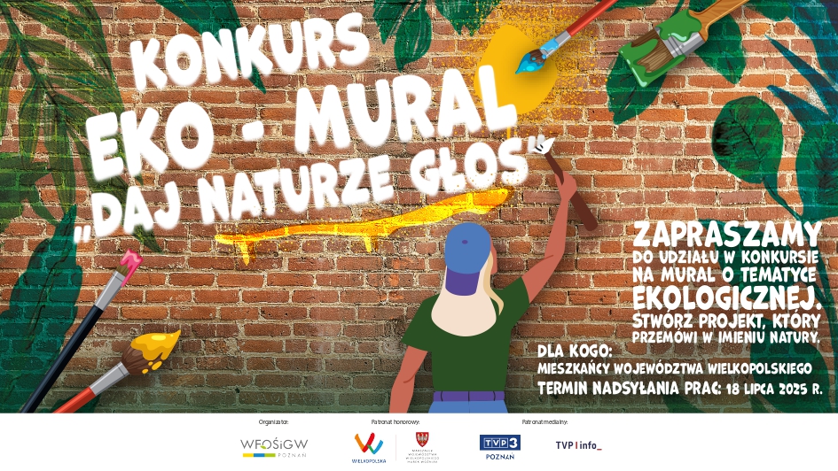 Wojewódzki Fundusz Ochrony Środowiska i Gospodarki Wodnej w Poznaniu ogłasza konkurs pn. „Wielkopolski Eko-Mural”. Przedsięwzięcie odbywa się pod Patronatem Honorowym Marszałka Województwa Wielkopolskiego i jest skierowane do wszystkich mieszkańców regionu. Prace konkursowe można wysyłać do 18 lipca 2025 roku.