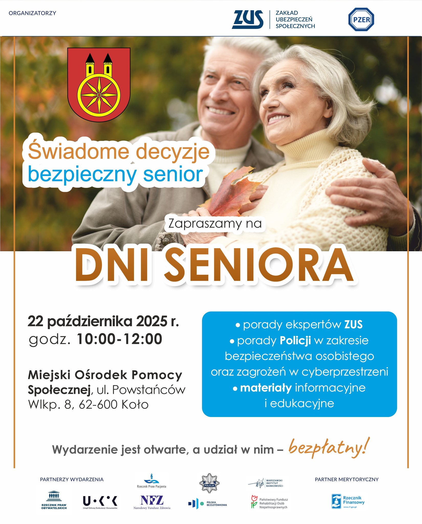 16 października, 2025 Aktualnosci Zapraszamy na spotkanie „Świadome decyzje – bezpieczny senior” Kiedy? 22 października 2025 r. (środa) Godzina: 10.00-12.00 Gdzie: MOPS w Kole ul. Powstańców Wlkp. 8 Wstęp wolny. – Udostępnij: