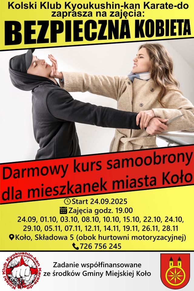 24 września, 2025 Aktualnosci Sport Zapraszamy wszystkie mieszkanki miasta Koła na darmowy kurs samoobrony! To świetna okazja, aby: zadbać o swoje bezpieczeństwo, poznać skuteczne techniki, spędzić aktywnie czas w dobrej atmosferze. Udział w kursie jest bezpłatny – kurs współfinansowany przez Gminę Miejską Koło. – Udostępnij: