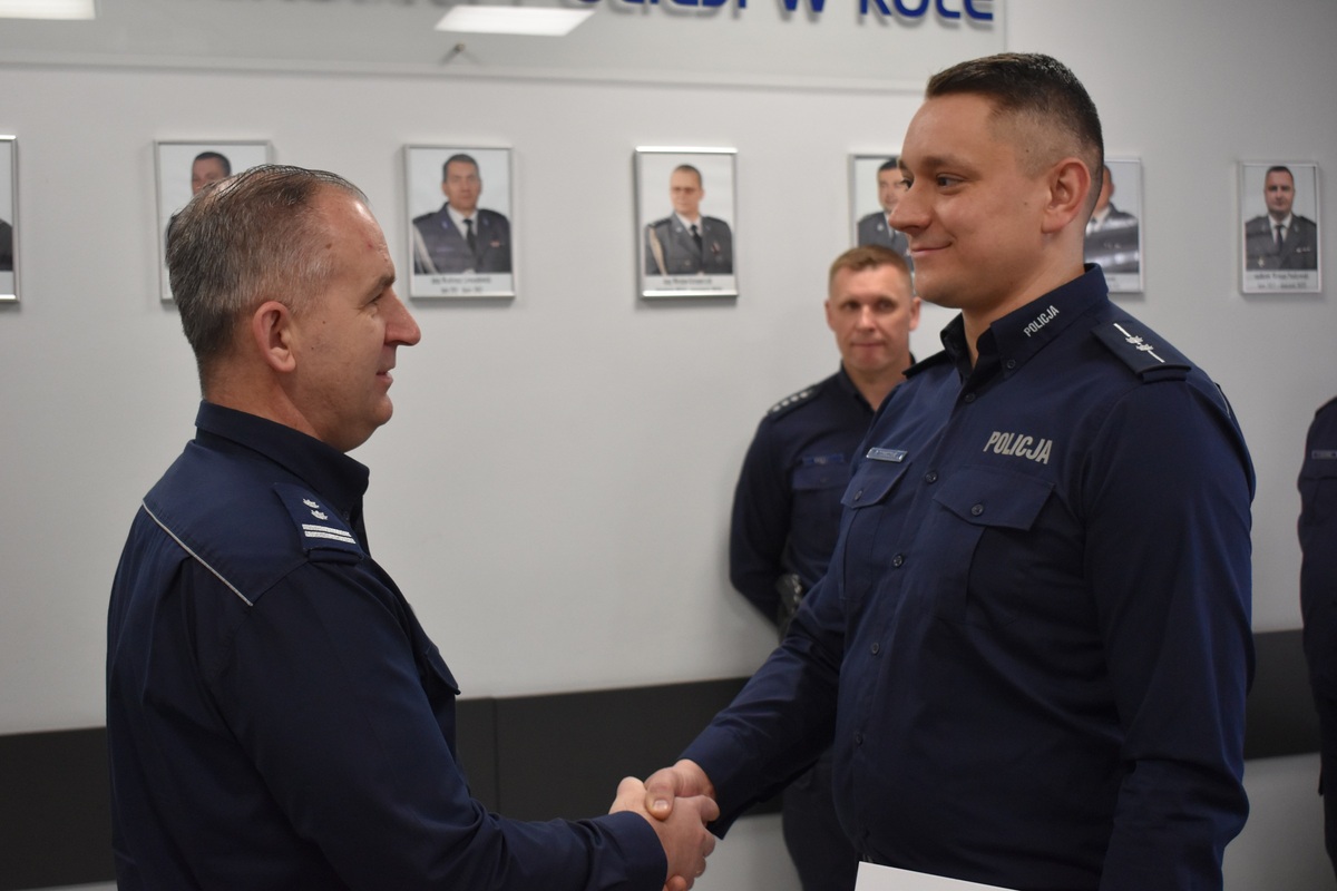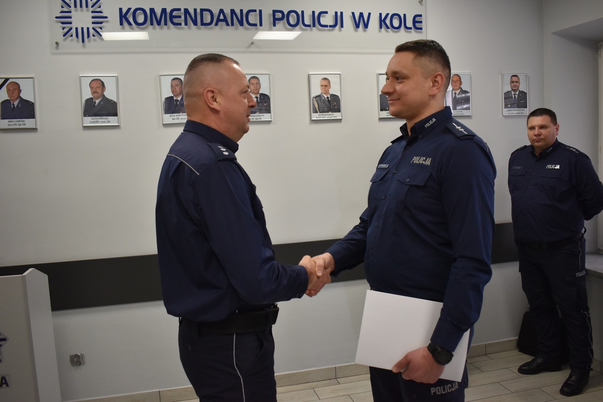 Podczas uroczystości Komendant Powiatowy Policji w Kole pogratulował asp. Przemysławowi Tomczakowi objęcia obowiązków oraz życzył powodzenia i sukcesów w realizacji nowych wyzwań służbowych.
