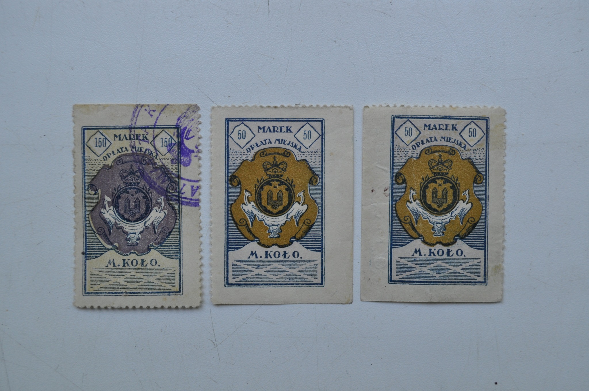 (1917 – 1919) emitował Magistrat Miasta Koła, będący odpowiednikiem dzisiejszego Urzędu Miejskiego. Potwierdzały one uiszczenie opłaty za różne czynności urzędowe np. za wydanie dokumentu czy zaświadczenia lub złożenie podania lub wniosku. Są one obok bonów miejskich Miasta Koła będących rodzajem lokalnego pieniądza cenną pamiątką czasów, gdy w naszej małej Ojczyźnie – Kole, oddolnie, organicznie i sprawnie odradzała się polska państwowość.