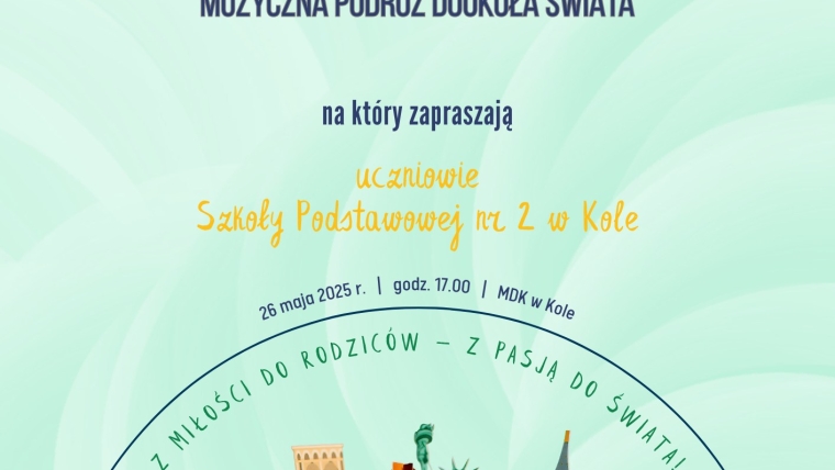 KONCERT „DZIECI RODZICOM – MUZYCZNA PODRÓŻ DOOKOŁA ŚWIATA” Serdecznie zapraszamy na wyjątkowe wydarzenie, podczas którego uczniowie Szkoły Podstawowej nr 2 w Kole wyrażą swoją wdzięczność rodzicom poprzez muzykę! Z miłości do rodziców – z pasją do świata! Data: 26 maja 2025 r. Godzina: 17:00 Miejsce: Miejski Dom Kultury w Kole To będzie niezapomniany wieczór pełen emocji, pasji i pięknych melodii…