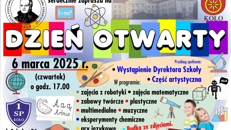 Szkoła Podstawowa nr 1 w Kole im. Stanisława Konarskiego zaprasza na DZIEŃ OTWARTY, który odbędzie się 6 marca 2025 r. o godz. 17.00. – W programie: zajęcia z robotyki, zajęcia matematyczne, zabawy twórcze, plastyczne, multimedialne, muzyczne, eksperymenty chemiczne, gry językowe, zabawy geograficzno-biologiczne oraz budka ze zdjęciami. –