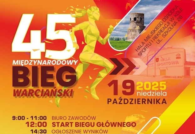 Do zobaczenia na Starcie 45 Międzynarodowego Biegu Warciańskiego, który w tym roku odbędzie się 19 października 2025. Startujemy z Parku im. Stanisława Moniuszki w Kole o godzinie 12:00. – – – – plakat: MOSiR w Kole mapka: KPP w Kole foto:: Archiwum 44 Międzynarodowy Bieg Warciański w Kole / kolskiefakty.pl