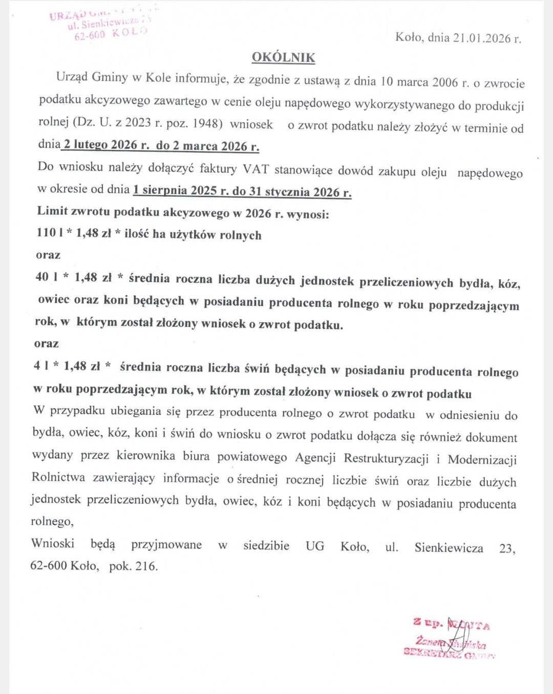 23 stycznia, 2026 GMINA KOŁO Gmina Koło informuje! Zwrot podatku akcyzowego zawartego w cenie oleju napędowego. – Udostępnij: