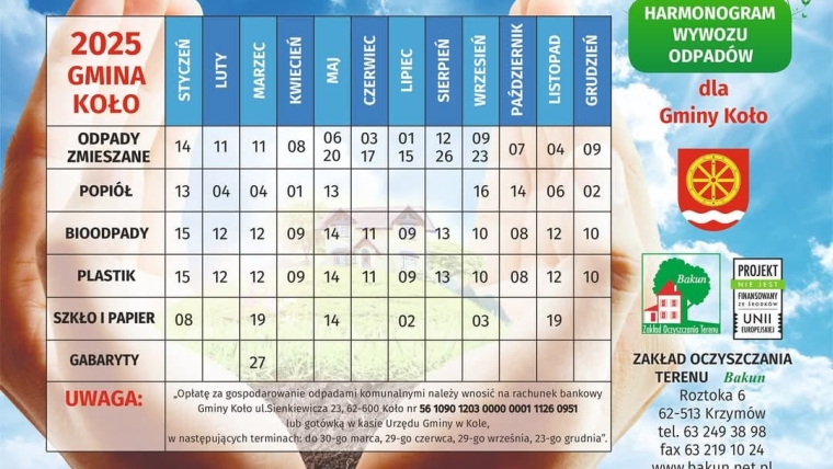 Harmonogram wywozu odpadów komunalnych na terenie Gminy Koło w 2025 roku