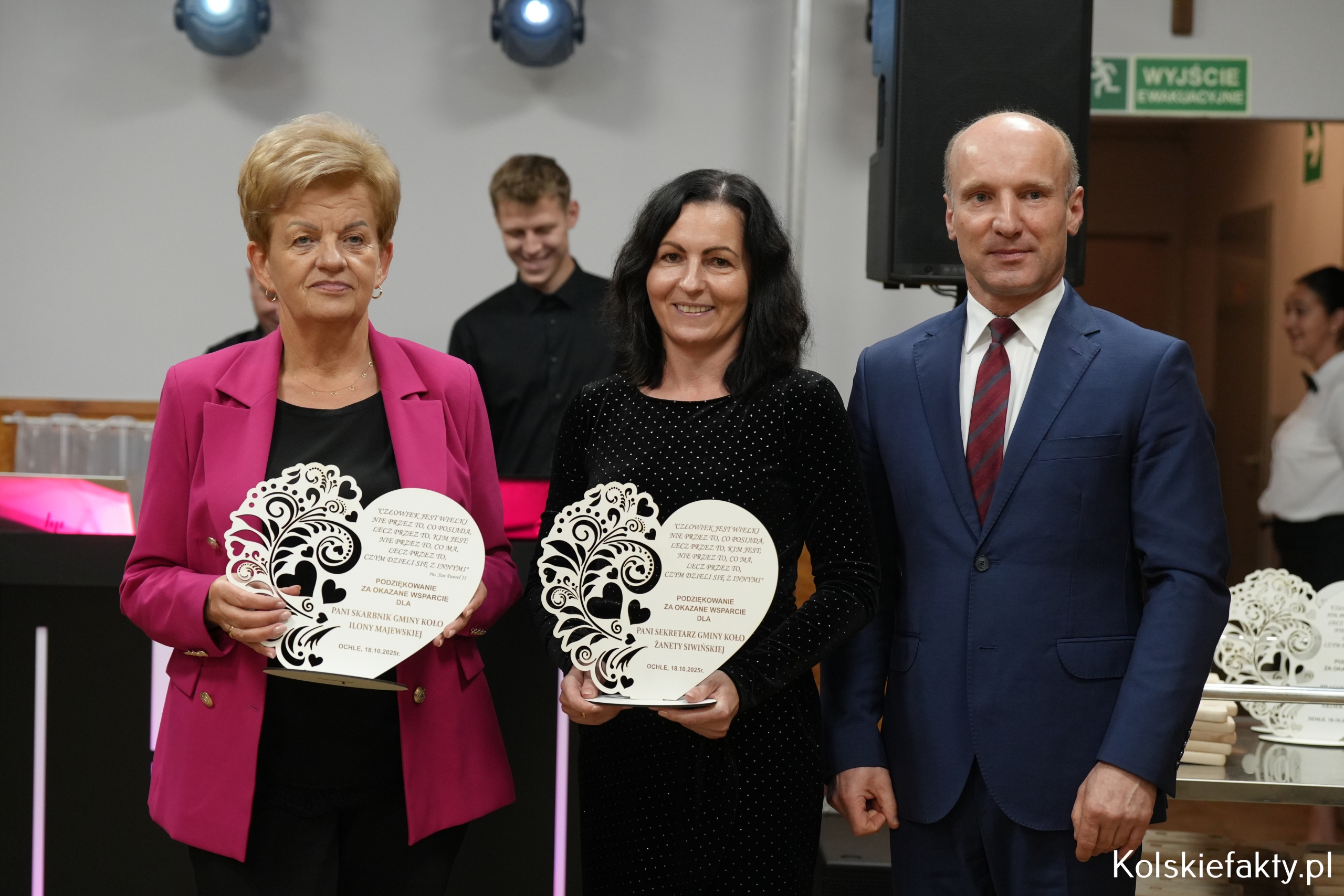 Ważnym punktem uroczystości było wręczenie podziękowań i drobnych upominków wszystkim Kołom Gospodyń Wiejskich z terenu Gminy Koło. Wyrazy uznania za ich aktywność, zaangażowanie i pielęgnowanie lokalnych tradycji przekazali Wójt Gminy Koło – Pan Mariusz Rybczyński, Sekretarz Gminy – Pani Żaneta Siwińska oraz Skarbnik Gminy – Pani Ilona Majewska.
