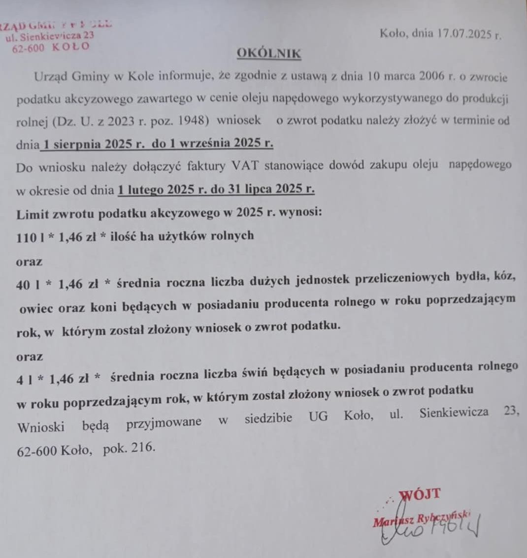 22 lipca, 2025 GMINA KOŁO Gmina Koło informuje! Okólnik w sprawie wniosków o zwrot podatku akcyzowego. – – Udostępnij: