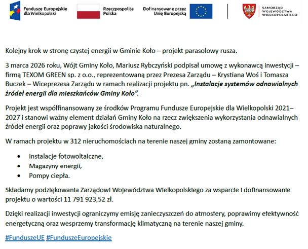3 marca 2026 roku podpisano umowę z firmą TXOM GREEN na realizację inwestycji w ramach projektu „Instalacje systemów odnawialnych źródeł energii dla mieszkańców Gminy Koło”.
