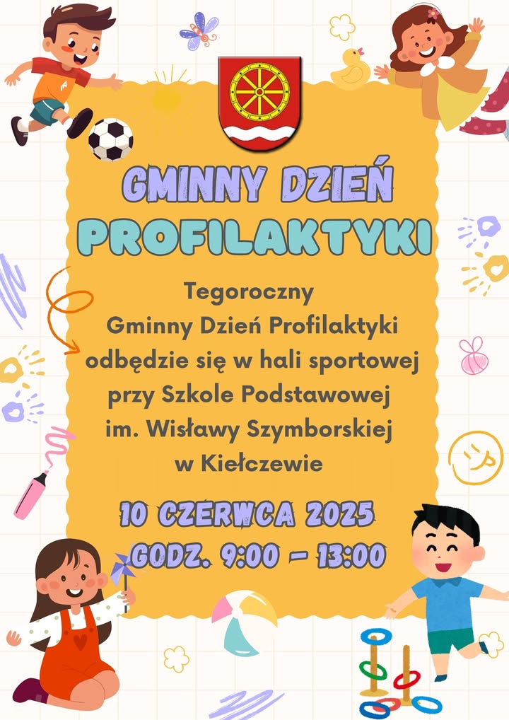 Już 10 czerwca 2025 roku, w godzinach od 9:00 do 13:00, w Gminnej Hali Sportowej przy Szkole Podstawowej im. Wisławy Szymborskiej w Kiełczewie Smużnym Pierwszym, odbędzie się wyjątkowe wydarzenie – Gminny Dzień Profilaktyki. Organizatorami inicjatywy są Pani Wiktoria Rosiak oraz Pani Roksana Mazur.