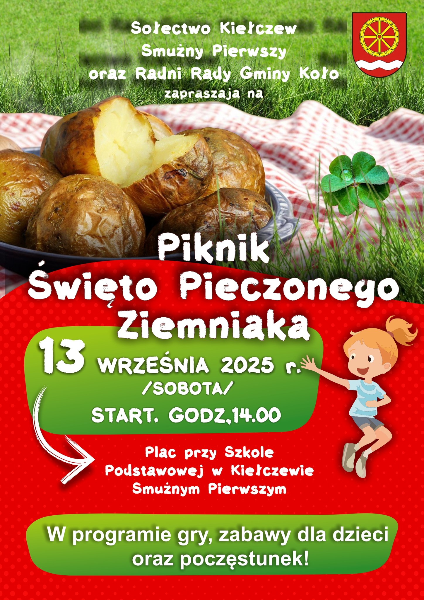 Zapraszamy na Piknik „Święto Pieczonego ziemniaka”, który odbędzie się 13 września 2025 r. o godzinie 14:00 w Kiełczewie Smużnym Pierwszym (Plac przy Szkole)