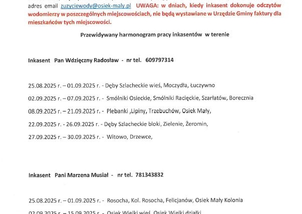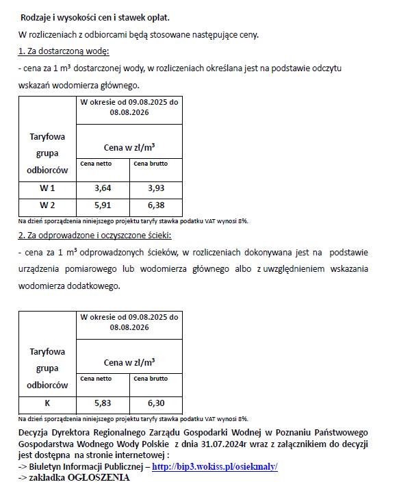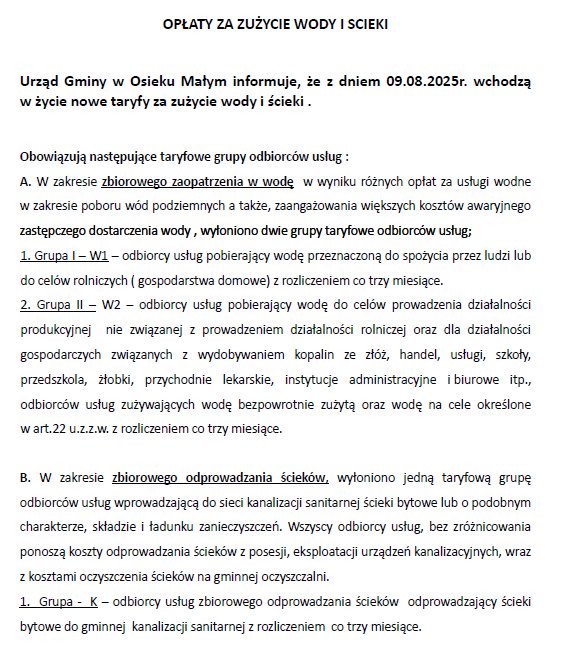 5 sierpnia, 2025 WIADOMOŚCI - GMINA OSIEK MAŁY Gmina Osiek Mały – nowe taryfy za zużycie wody i ścieki Urząd Gminy w Osieku Małym informuje, że z dniem 09.08.2025r. wchodzą w życie nowe taryfy za zużycie wody i ścieki. – Udostępnij: