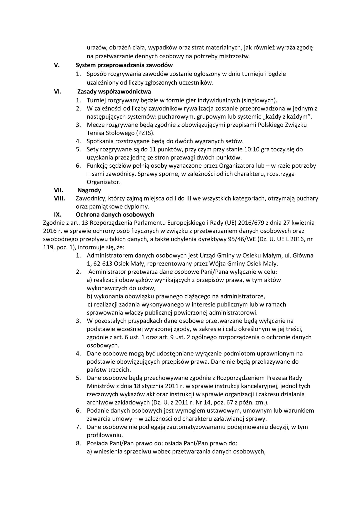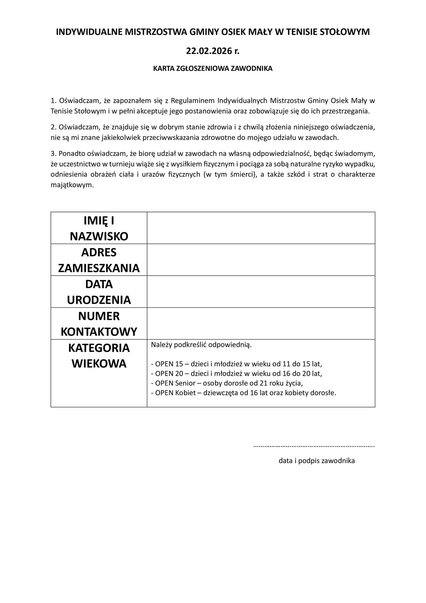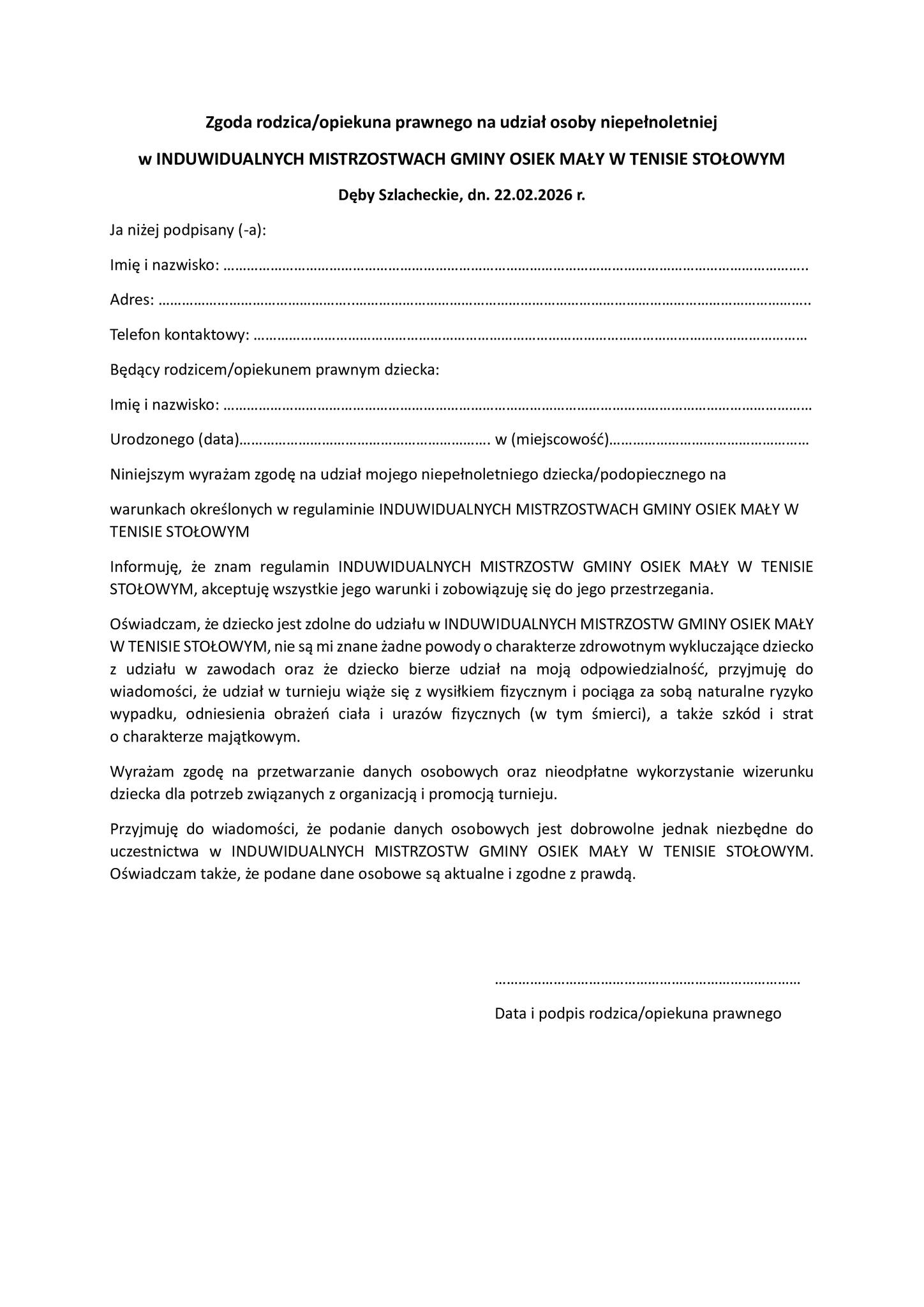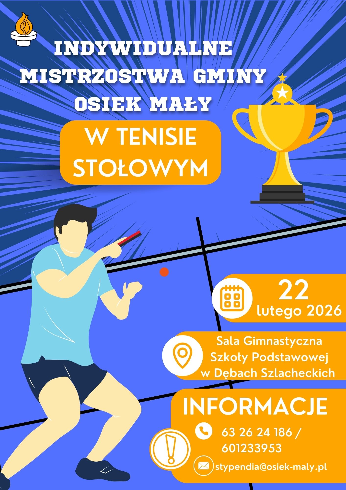 11 lutego, 2026 WIADOMOŚCI - GMINA OSIEK MAŁY INDYWIDUALNE MISTRZOSTWA GMINY OSIEK MAŁY W TENISE STOŁOWYM 22 lutego 2026 r. Sala Gimnastyczna Szkoły Podstawowej w Dębach Szlacheckich ZAPRASZAMY !!! – – Udostępnij: