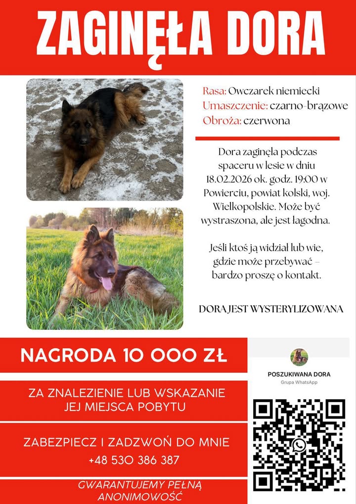 Ważne !!! 23.02.2026 widziana w lesie w Chełmnie – Rzuchowie !(Powiat kolski) Ponadto właściciel ufundował 10 000 zł za wskazanie miejsca pobytu lub odnalezienie Dory!