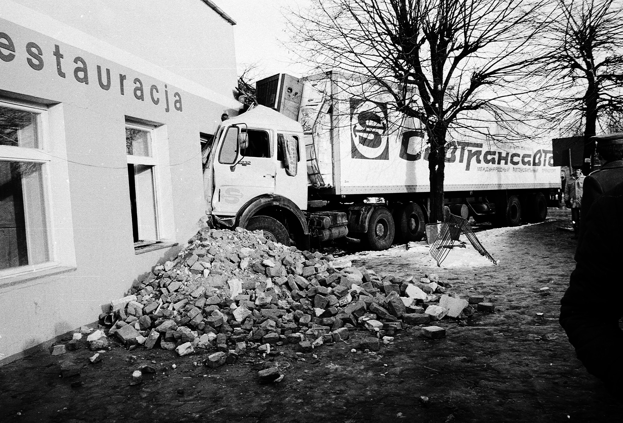 Chyba najbardziej spektakularny wypadek komunikacyjny w Kole lat 80-tych ubiegłego wieku. Na zdjęciu Ryszarda Fórmanka radziecki tir wbity w restaurację „Warszawska” na ul. Sienkiewicza